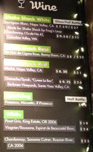 Shake Shack, the burger and shake place that people in NYC (minus me) will wait on an hour-long line for, serves wine too – and some are actually pretty decent! They’ve got a Bonny Doon Vin Gris rosé, a King Estate Pinot Gris, a Viognier/Rousanne on the list (interesting), and even a Sauvignon Blanc that’s made just for them. With a burger, however, I’d go for the Beckmen Grenache/Syrah (SS sells a bottle for $36 but it retails for about $16).