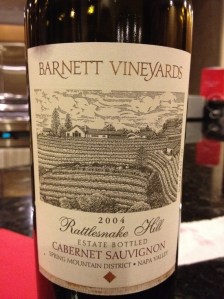 Found! And they drink well – the 2004 Barnett Rattlesnake Hill Cabernet Sauvignon goes for about $120 and reviews say it has flavors of concentrated pure Cassis, dark raspberry, cream chocolate and brown sugar. On the Barnett website, it says that “typically the Rattlesnake Hill wines are very powerful, structured and multi-layered wines with silky tannins.”