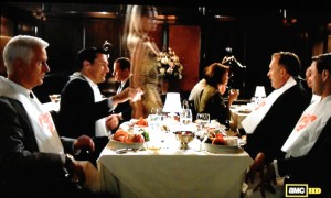 It makes total sense that Pete would order what the client ordered. Don’t know what kind it was other than white, but my favorite wines with lobster are White Burgundy and Chablis (they’re both Chardonnay, but not the over-oaked California kind). Anyway, this ups our count by two!