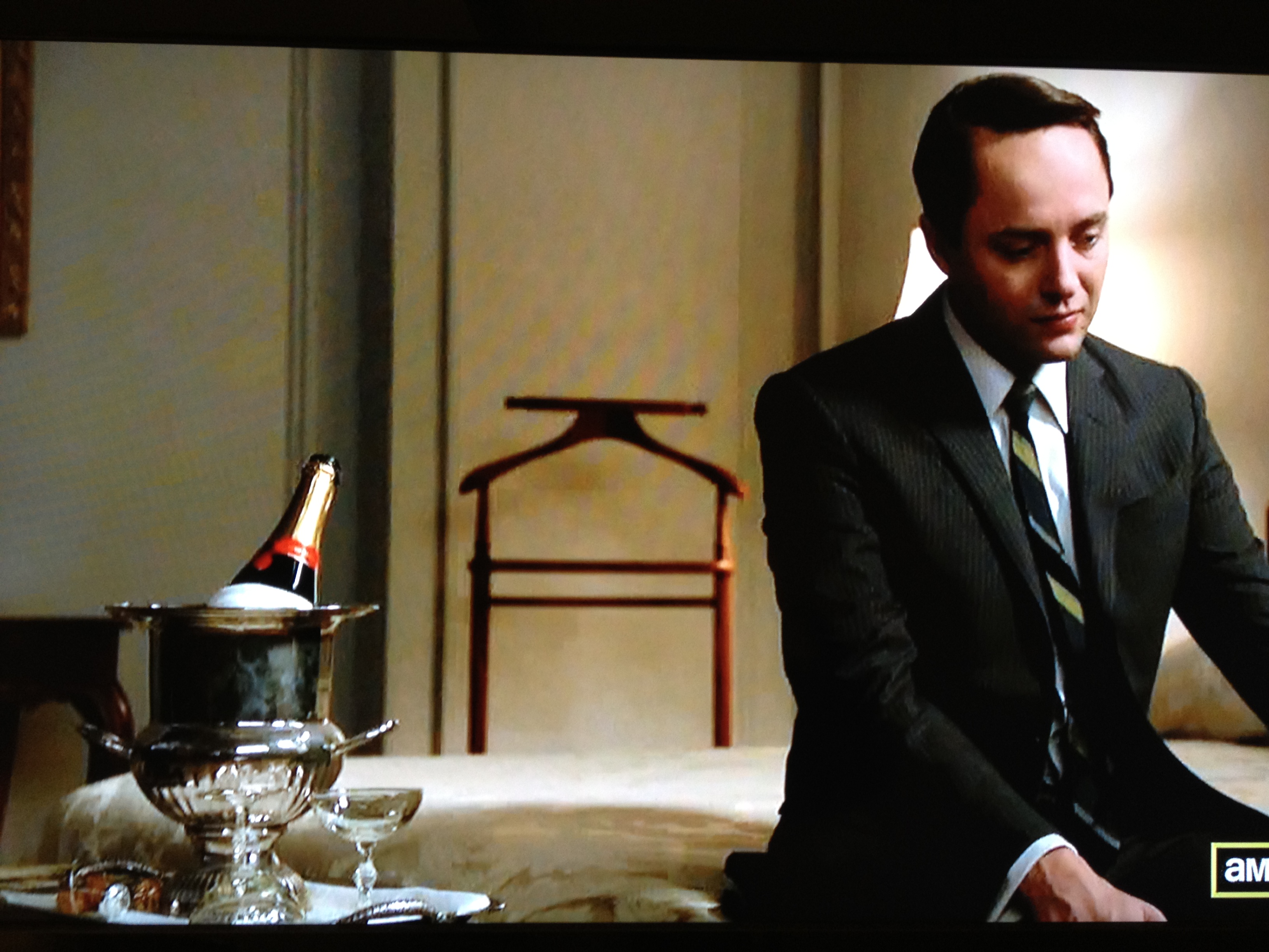 We then saw Pete waiting for Beth in the hotel room with some Champagne (looks like it could be Bollinger) on ice. Pete’s always drinking Champagne when he’s not having a cocktail, but obviously none of it was drunk since she never showed. And as we know, bubbly doesn’t count in the wine count anyway!