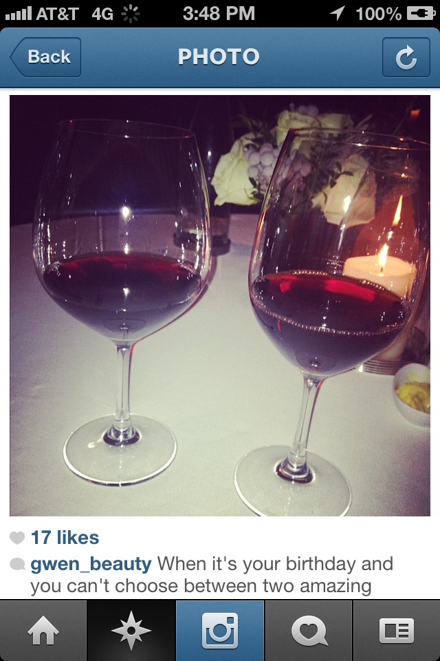 Gwen celebrated her birthday at Per Se – NBD – and tagged me in this pic with not one but two wines. Why? “When it’s your birthday and you can’t choose between two amazing wines, the fancy sommelier will pour you half a glass of each!” So awesome, though I can’t decide between wines on every day of the year…