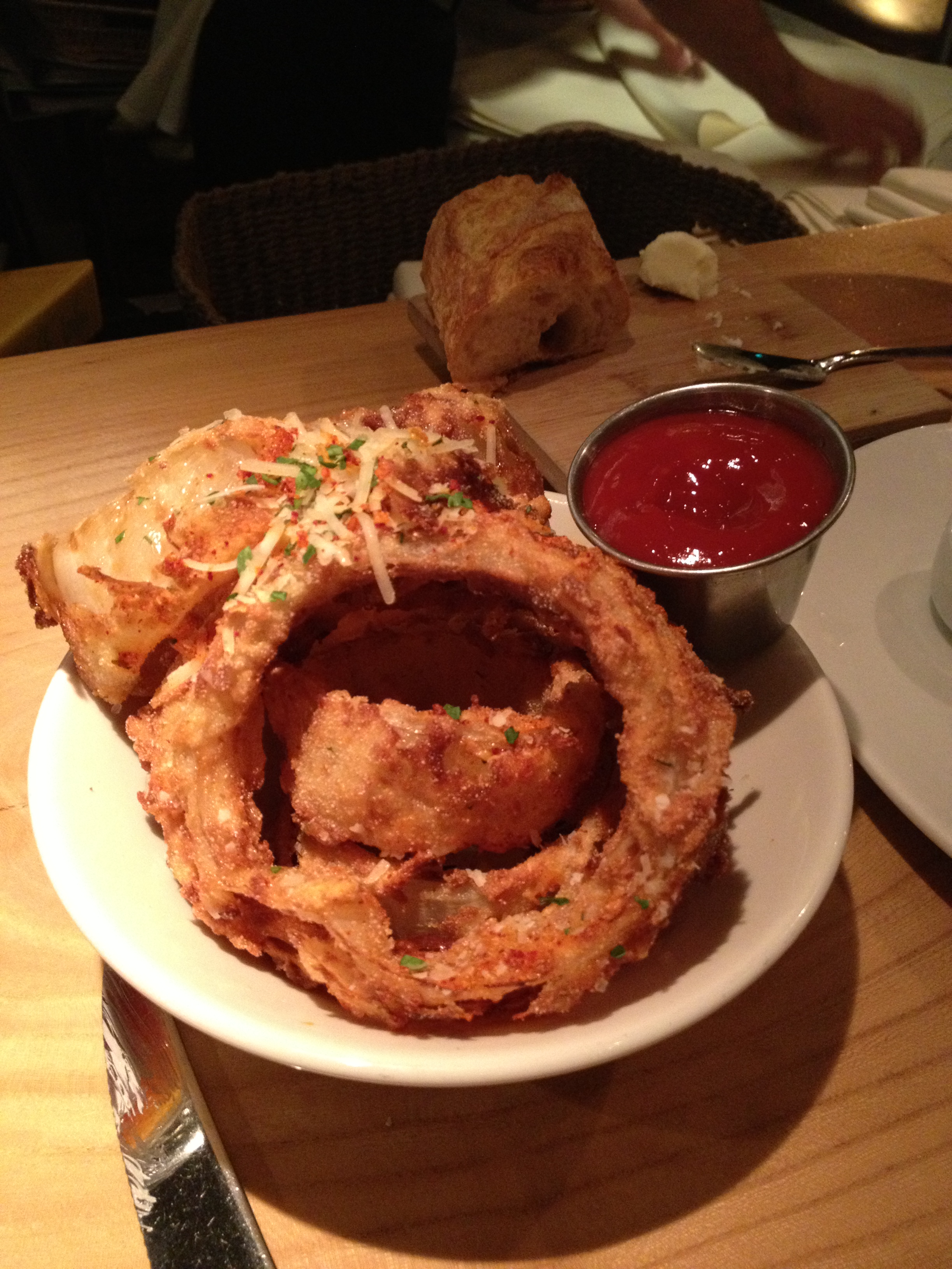 We almost didn’t get these, but threw them on last minute. Thank god! We each had one bite and immediately said they might be the best onion rings we’ve ever eaten. They’re sprinkled with some paprika and parmesan (lightly, just a perfect little amount), but the real key is the thick, crucnhy texture of the onions. No flimsy little slivers that slip out of the batter as you bite into it. Fantastic. The burger and pan-roasted chicken were really good too.