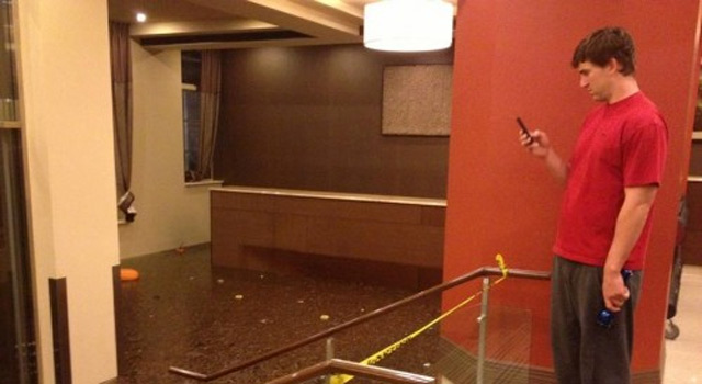 With all the craziness and people losing homes and being displaced, I really hadn’t thought about football. But many Giants and Jets live in New Jersey where the stadium is, and yesterday Kate Mara (niece of Giants owner John Mara) tweeted a pic of Eli Manning assessing the damage to his Hoboken apartment building. It shot through the Twittersphere to me: