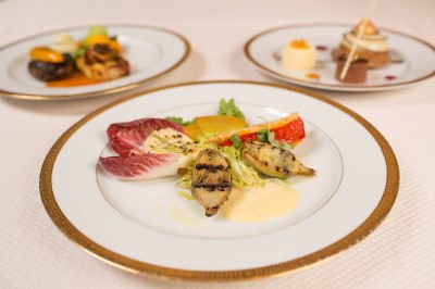 Appetizer: Grilled artichoke on frisée served with fennel-tomato-lemon mousse, kabocha-pumpkin smoked-dried-tomato tart and pepper-honey goat cheese.