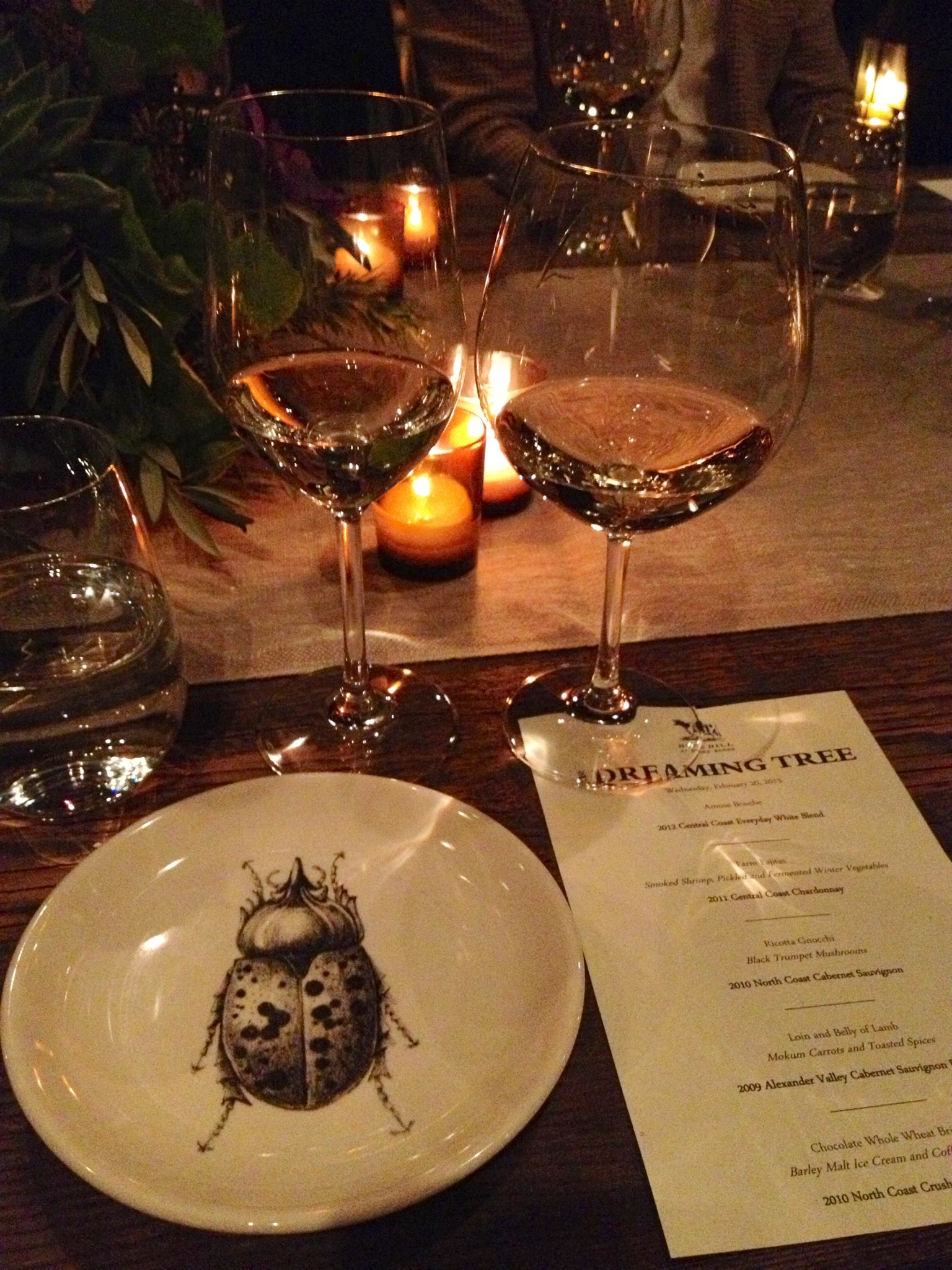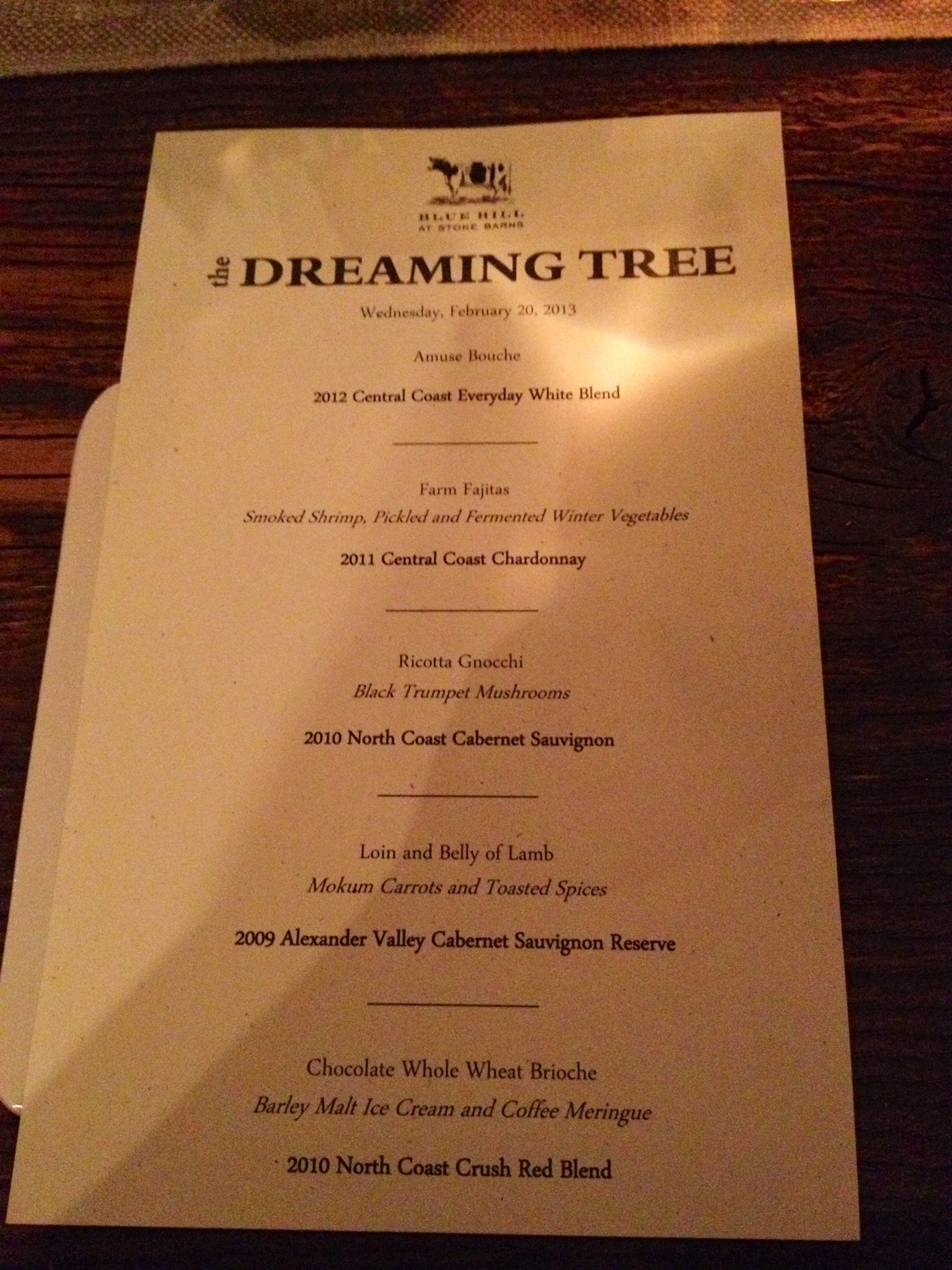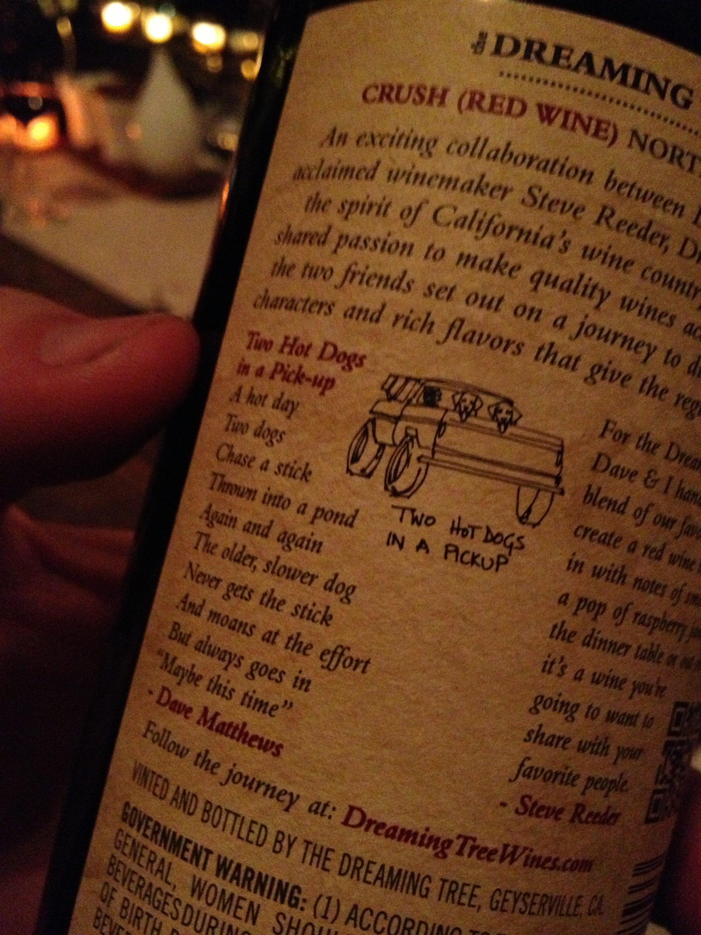 We had the 2010 Crush red blend (78% Merlot, 13% Syrah, 6% Zinfandel, 2% Petite Sirah, 1% Malbec, 1% Cabernet Sauvignon) with brioche dessert. It wasn’t really rich or sweet enough to go with the dessert, and not my fave Dreaming Tree wine out of the bunch. It does, however, feature Tom’s two dogs and little Dave poem on the back label.