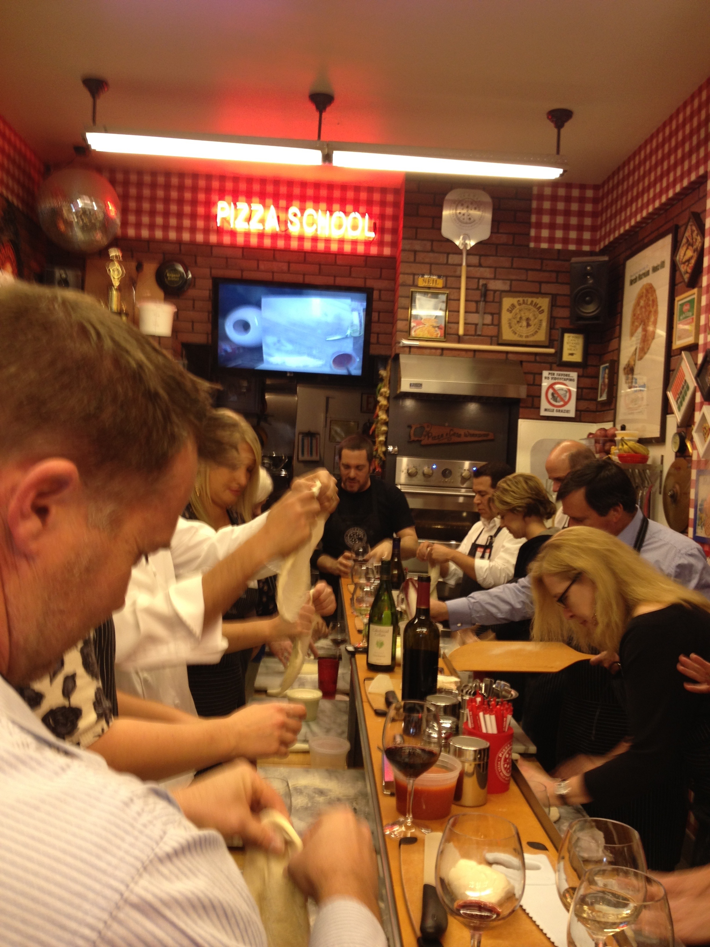 We’re hitting pizza school! Kneading our dough (tip: pat it like soft bongos), slapping on awesome toppings (Brussels sprouts – who knew?), and of course drinking some wine.