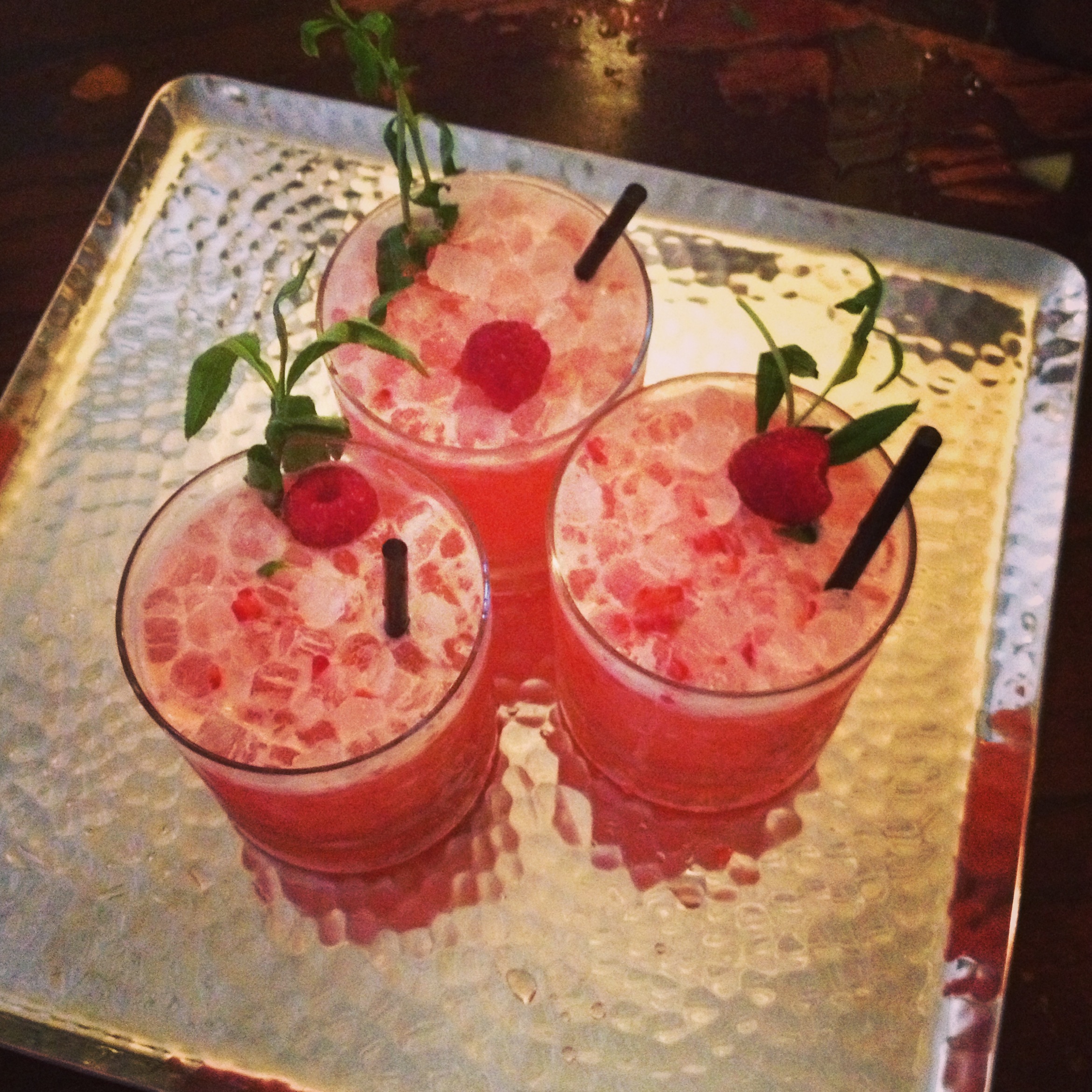 Muddle the raspberries and tarragon, and then add the rest of the ingredients. Add ice, shake and strain over crushed ice (they used these totally cool pellet ice cubes which I’d never seen before) into a glass. Garnish with a raspberry and tarragon sprig.
