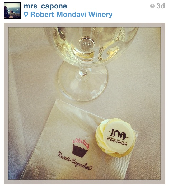 So remember how it was Robert Mondavi’s 100th birthday this past Tuesday? Well they had a huge bash at the winery and had wine cupcakes!! Kara’s Cupcakes made these vanilla “Cent’anni” cupcakes with Fumé Blanc curd filling and Fumé Blanc buttercream frosting (and there’s actual wine in the frosting). So grapefriendy!