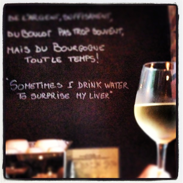 Saw this last night at the adorable Sel et Gras and had to take a pic. I had to maneuver myself by the board, with my refreshing glass of Chablis, and everyone was giving me strange looks except for the girl at the bar who said she also took a pic of the quote. Grapefriends unite!