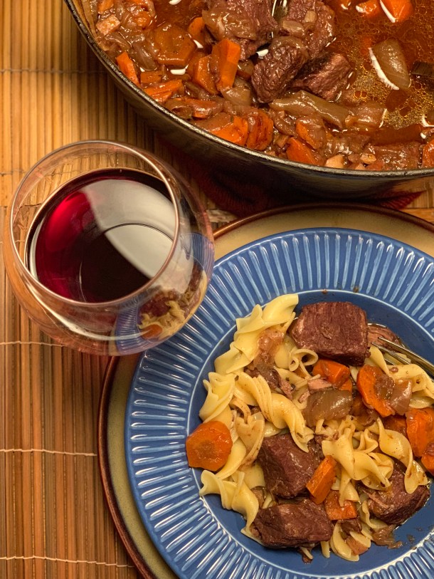 But even though it’s called Bourgignon, which means it’s from Burgundy, I usually don’t use a Burgundy to make it or even drink one with it. Burgundy’s red grape is Pinot Noir, which is a light red. I prefer to cook with and drink a bigger red, usually a Bordeaux-style blend (primarily Cabernet and Merlot). Maybe there’s some cheffy reason you should use a Pinot Noir to stew meat, but my Bordeaux makes it taste awesome.