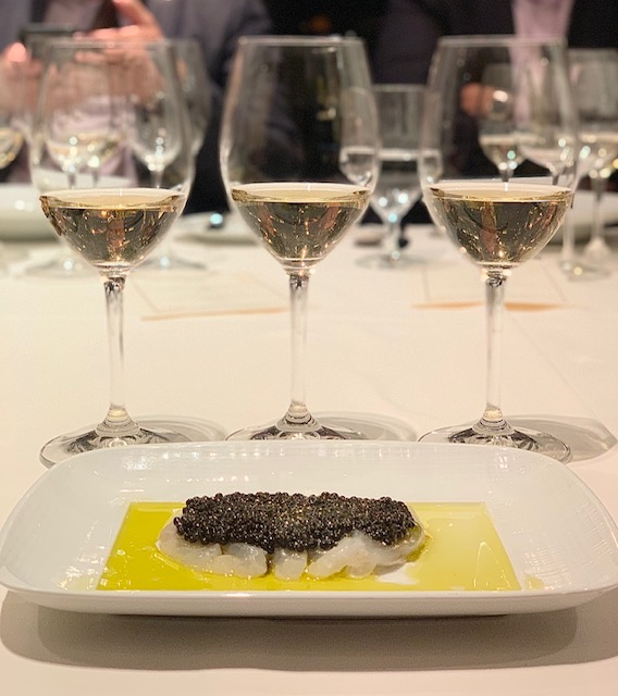 Chasselas is the most widely planted white grape in the country, so our flight began with the lemony, herbal and high-acid Château d’Auvernier Neuchâtel Blanc 2021. Call me influenced, but it was so crisp and refreshing it was like drinking an Alpine breeze. The second in our white flight was the Sandrine Caloz Petite Arvine, “Les Clives” 2018, a grape grown since 1600 that delivered deeper golden apple. Last, we had the Weingut Donatsch Completer 2018 which was full of waxy yellow melon and white peach. The Completer grape is named after Completorio, the monk’s last evening prayer after which they would drink a final glass of wine for the day. Love it. All were quite good with the fluke crudo and caviar, but the acid in the Chasselas made it really sing.