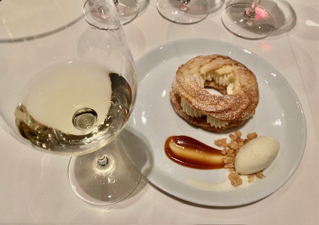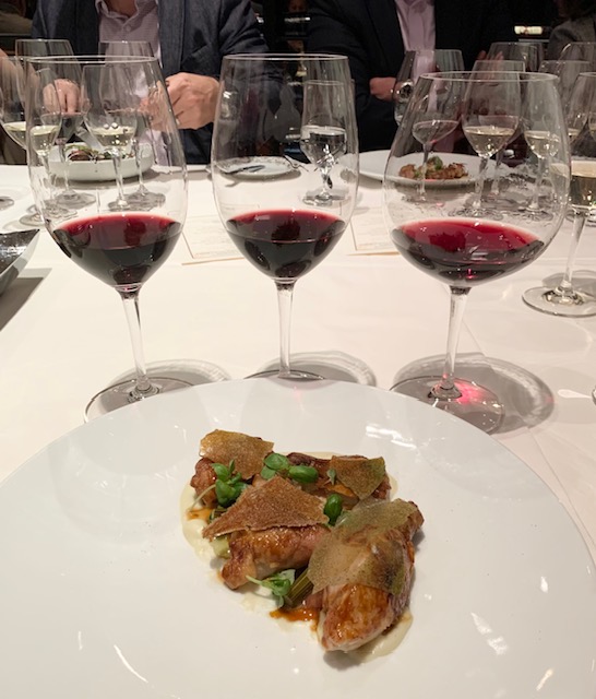We then moved on to three reds. First, the Weingut Fromm Pinot Noir Village 2018 which is from a high mountain region that produces a lightly earthy style of Pinot Noir. The Jean-René Germanier Syrah Cayas 2019 had a really light body for Syrah with earthy blackberry and a hint of funk. My favorite of the tasting, however, was the Castelto di Cantone UNGULUS Rosso Cabernet Franc Riserva Ticino DOC 2020. This is not your funky light Loire style of Cab Franc. The winemaker vinifies some of the grapes dry (as they do in the process for making Amarone) which concentrates the flavors. The blueberry and black cherry notes were simply scrumptious, and a perfect pair for the rhubarb sauce on the cornish game hen.